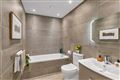 Fully tiled, bath with telephone shower unit, wall hung sink unit with storage under and LED mirror over, chrome wall towel rails, WC, extractor fan, recessed lighting.