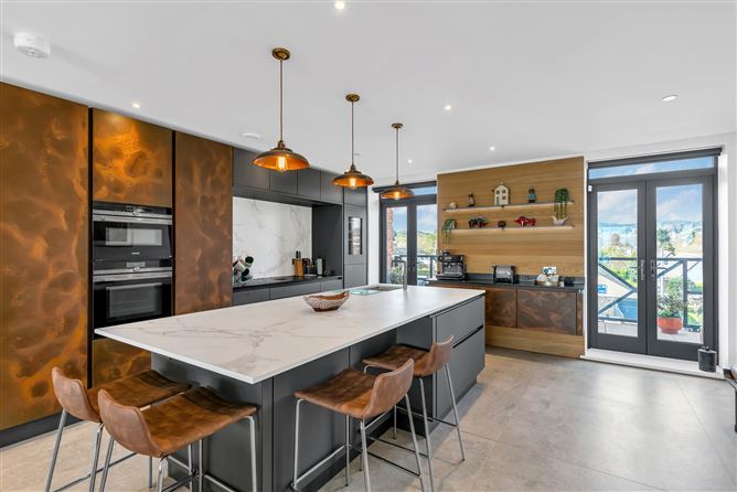 Porcelain tiled flooring, bespoke Leicht German kitchen, feature 2.8m x 1.22m Dekton island unit encorporating Entzo single piece countertop and feature pendant lighting, inset stainless steel sink unit, Quooker Pro3 boiling and cold water tap, Bora Pure induction Cooktop hob incorporating integrated Cooktop extractor, Entzo splashback, Siemens integrated appliances, Liebherr integrated wine cooler, bespoke electric ‘Zebra’ blinds, 2 x French doors to west facing balcony.
