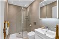 Porcelain tiling throughout, double width shower cubicle with mains operated waterfall head and telephone shower unit, glazed panelling, wall hung sink unit with storage, wall hung mirrored vanity unit, additional wall hung storage unit, chrome towel rails, WC, exterior sash window, recessed lighting.