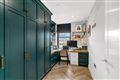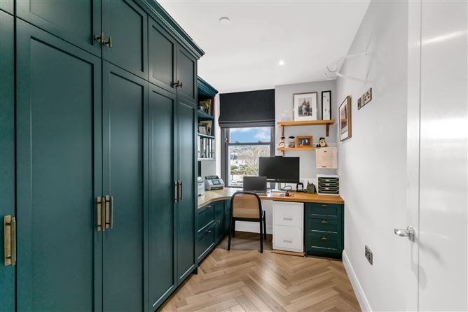 Herringbone oak flooring, floor to ceiling bespoke storage units, bespoke shelving and office desk with solid oak desktop, Sash window with bespoke Roman blinds, recessed lighting.