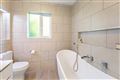 Fully tiled bathroom, feature bath with a waterfall tap and telephone hand shower, wash hand basin with under storage unit, recessed wall mirror with LED lighting, chrome heated towel rail.